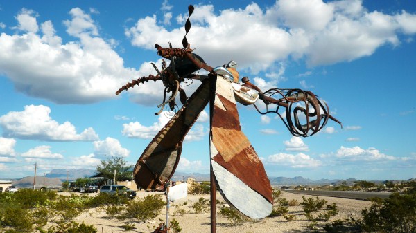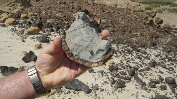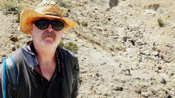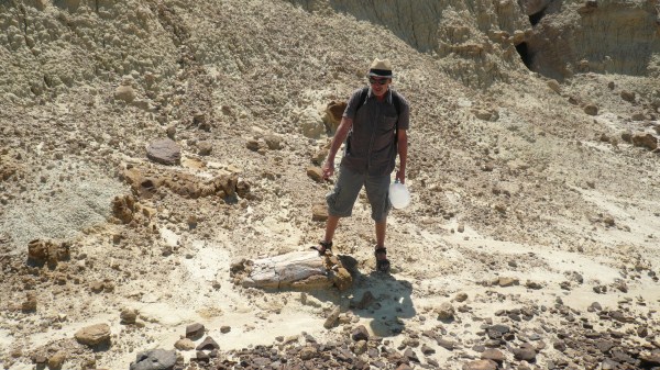 Bin früher auf als die Leute hier. Nirgends eine Möglichkeit zu frühstücken hier in Ghostown, 20 miles von der Grenze zu Mexiko im äußersten Südwesten des Nationalparks. Ich fahre zur Hauptstraße. Dort an der Kreuzung habe ich gestern eine Tankstelle mit Restaurant gesehen. Es ist ganz in der Nähe, wo Tim Jean, der Geologe, den ich gestern kennen gelernt habe, seinen Trailer stehen hat. Bevor ich ihn wecken will, versuche ich hier bei einem Cafe, der übrigens ununterbrochen nachgefüllt wird, aber leider nicht verdient, Cafe genannt zu werden, ins Netz zu kommen, und es ist tatsächlich Wifi vorhanden. Tim hat seine Verabredung mit mir nicht vergessen. Er kommt – ausgerüstet mit Wasserkanister und GPS – mich abzuholen und nimmt mich mit seinem Chrysler zu einem Parkplatz in der Nähe mit, von wo aus wir zu Fuß in die Wüste gehen, um den Ort zu finden, wo vor über 60 Millionen Jahren ein Komet auf diese Region nieder gegangen sein soll: The day the dinosaurs died, eine Stehsatz, den er während seiner geologischen Ausführungen, die ich Mühe habe zu verstehen, ständig wiederholt. Er gehört zu den Wissenschaftlern, die es für absolut gesichert halten, dass es Katastrophen waren, die der Erdoberfläche den Stempel innerhalb eines Tages im Mesozoikum aufgedrückt haben, und nicht, wie die Unitarier behaupten, eine evolutionäre Entwicklung über Jahrmillionen.