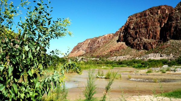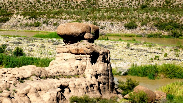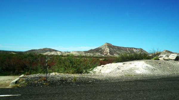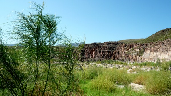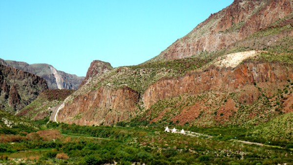 Nach einem Frühstück mit Wifi verlasse ich den Big Bend Richtung Lajitas, einen Umweg über die den Rio Grande säumende Straße, den Camino del Rio, den River Road nach El Presidio nehmend. Und ich habe es nicht bereut. Nach soviel Wüste endlich üppiges Grün, Oasen aus Schilf und Ocotillo entlang des braun mäandernden Flusses, der sich hier 120 km lang sein Bett gegraben hat. Noch einmal lässt Lajitas grüßen, was soviel wie „flache Steine“ bedeutet, eine Postkutschenidylle heute mit Golfplatzresort, aber auch ein Ort, der wegen des niederen Wasserstandes noch bis heute illegale Grenzübertritte begünstigt. Aus diesem Grunde wurde hier wie an anderen crossing points ein Fort errichtet, in welchem die berüchtigten Texas Rangers stationiert waren, um die Silbertransporte zu sichern und in der Prohibitionszeit den Alkoholschmuggel zu unterbinden.