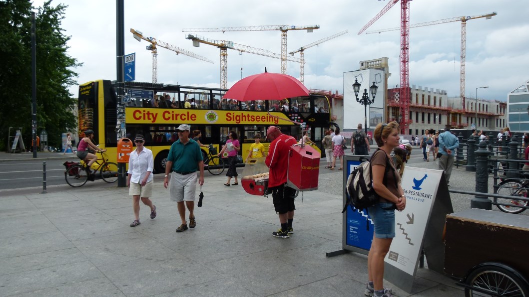 In einer Seitenstraße entdecken wir den letzten Wachtturm, welcher der Bauwut im ehemaligen Todesstreifen noch nicht zum Opfer gefallen ist. 3 junge Männer haben sich zusammengetan, um diesen Turm als Denkmal an die unselige Teilung der Stadt vor Abriss und Zerfall zu retten. Kaum mehr Brachen und unbebaute Flächen, welche die Architekten zu städtebaulichen Éxperimenten herausfordern, wie noch vor 15 Jahren, aber immer noch Kräne: Zeugen nicht abgeschlossener Bauvorhaben. Eine Stadt im permanenten Übergang.