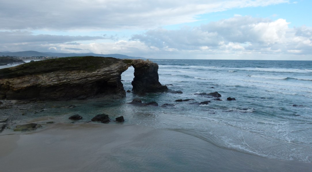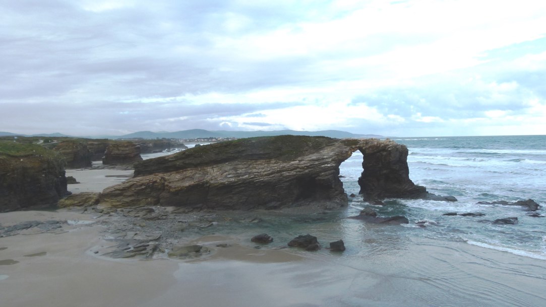 Mit den Füßen im Sand und den Augen im Himmel wandern wir wie in einem überdimensionalem Kirchenschiff zwischen den Stützpfeilern aus glänzenden Schieferplatten den Strand entlang, bis ein Weitergehen mit Schuhen wegen der hereinbrechenden Wellen nicht mehr möglich ist. Endlich Galicia, wie ich es mir vorgestellt hatte.