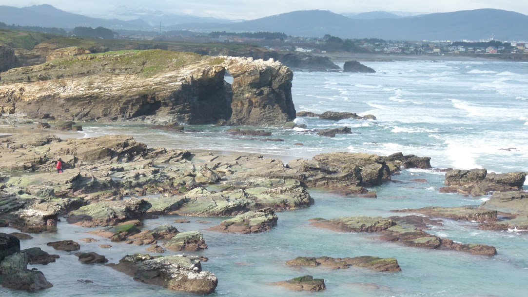 Aber in Ribadeo gewesen zu sein, ohne der Praia das Catedrais einen Besuch abgestattet zu haben, könnten wir uns wohl nicht verzeihen. Also warten wir die Ebbe ab, mieten ein Taxi und fahren mitten im Schneeregen, dem die Scheibenwischer kaum mehr nachkommen, hinaus an die Küste. Dort – erzählt uns der Taxifahrer, mit dem ich aufgrund meiner Spanischkenntnisse kommunizieren kann – hätten wir wenigstens den Strand für uns, denn im Sommer sei mit bis zu zehntausend Besuchern an Wochenenden kein Fortkommen. Bei Sturmfluten könne es außerdem vorkommen, dass die aus den Gewalten des Meeres mit der Geduld der Zeit bis zu 30 Meter hoch aufgeschichteten Schieferdome überspült werden. Just in dem Augenblick als wir ankommen und schon gefürchtet haben, dass wir diese spektakulären Naturphänomene nicht einmal vom Fenster des Taxis aus zu Gesicht bekommen, klart der Himmel auf, der mit der wild aufgepeitschten See und den Domfelsen an düstere Gemälde El Grecos erinnert.
