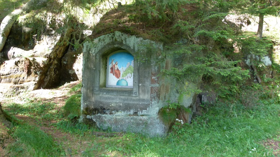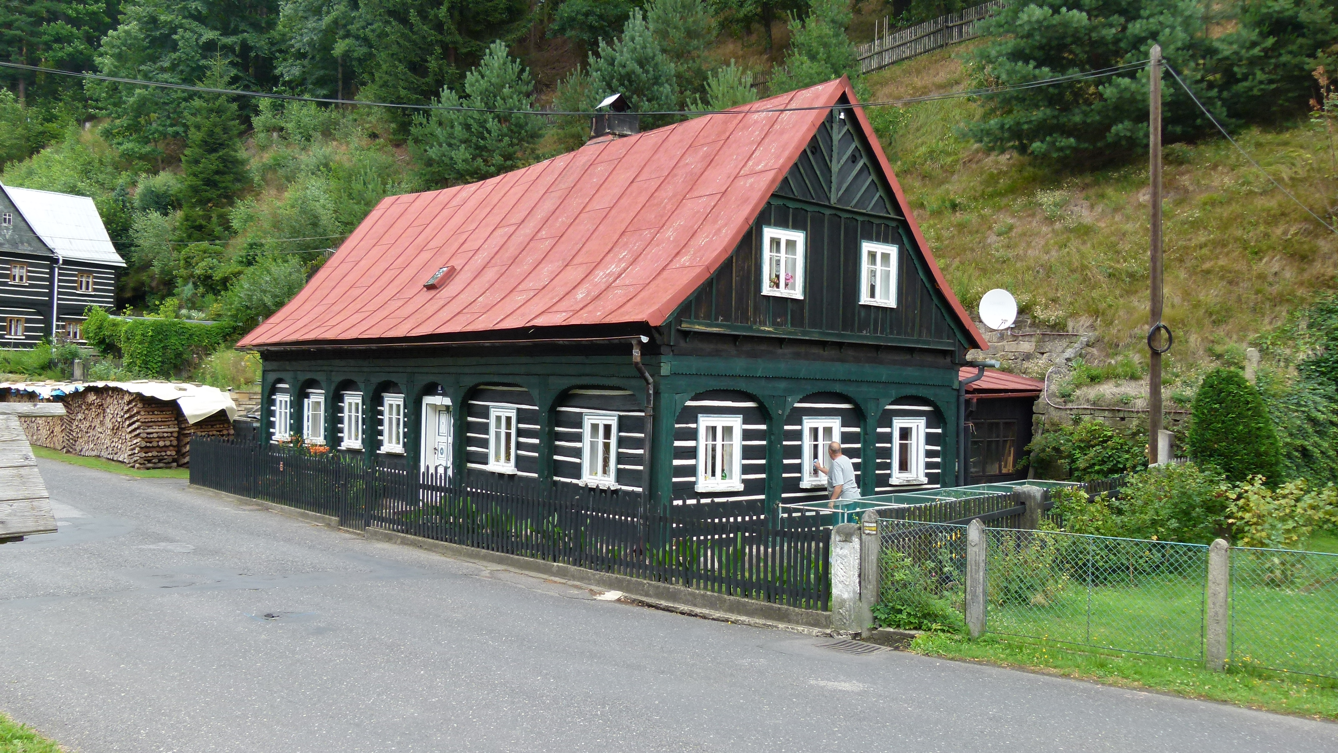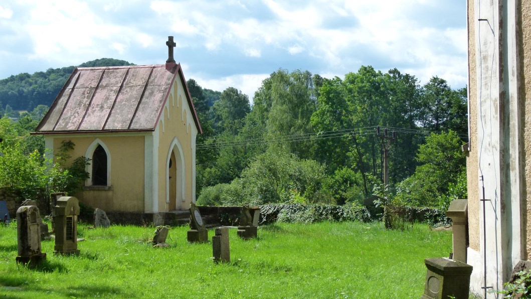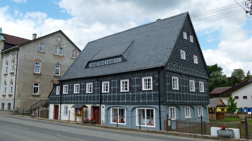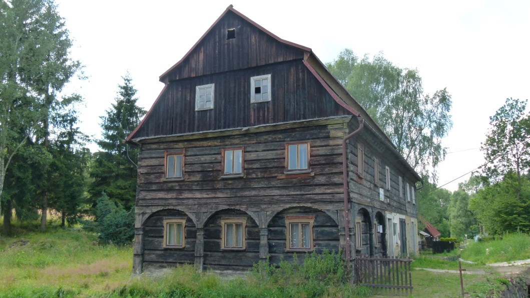 beherbergt auch ein Baudenkmal aus der Barockzeit. Leider ist es verfallen wie Vieles hier. Vor allem Kirchen. Die Dächer sind eingestürzt und durch die Fenster schaut der Himmel. Entweder es fehlt das Geld oder es gibt kein Interesse, diese Zeugnisse hoher Baukunst wieder instand zu setzen.Bleiben wir beim Umgebindehaus, mit dem die Handwerker der Gegend eine geniale Verbindung von Block- und Fachwerkbau geschaffen haben. Umgebinde heißt, dass ein hölzernes Stützwerk, – Holz und Bruchstein sind aus der jeweiligen Umgebung -, die Backstube umschließt und das Dach und Fachwerkobergeschoß trägt. Die Haustürstöcke und reich verzierten Säulen, das Walmdach mit den Ochsenaugen, die oft mit Geranien schmuckvoll ausgestatteten Kastenfenster sind eine Freude fürs Auge, das man gern schließt, um nicht an die Vertreibung derer erinnert zu werden, die diese Häuser seit Generationen bewohnt hatten.