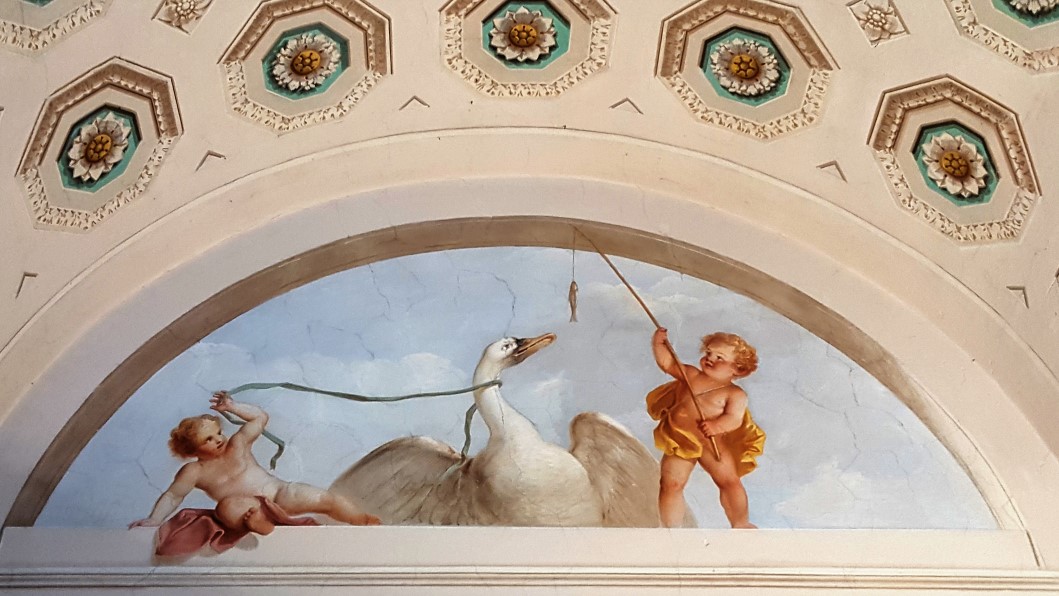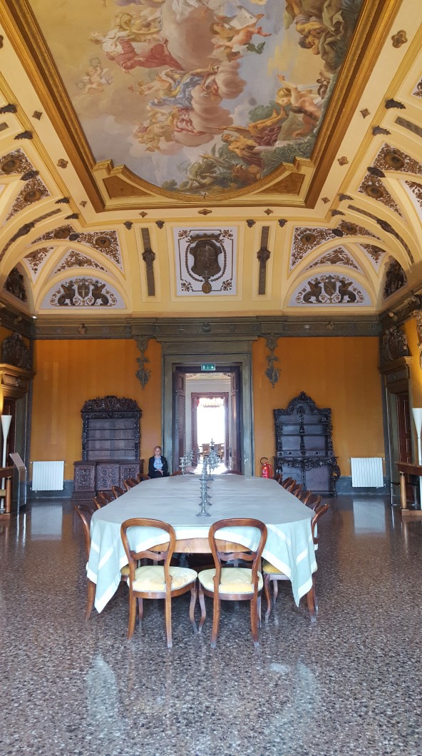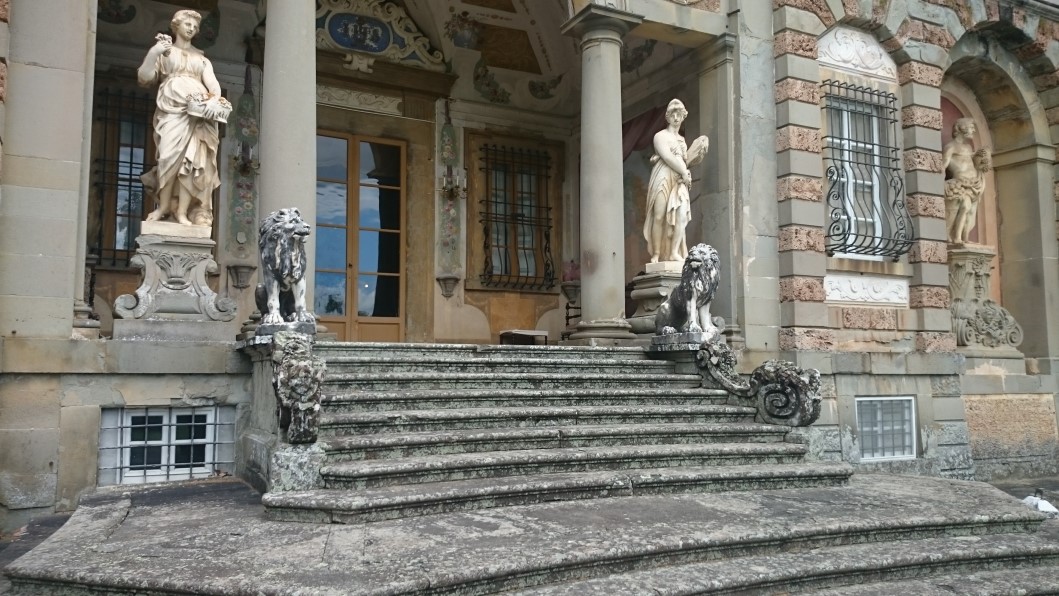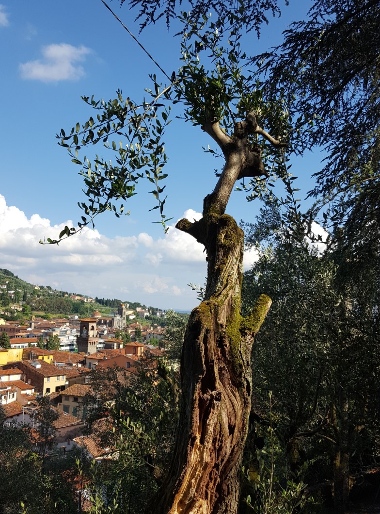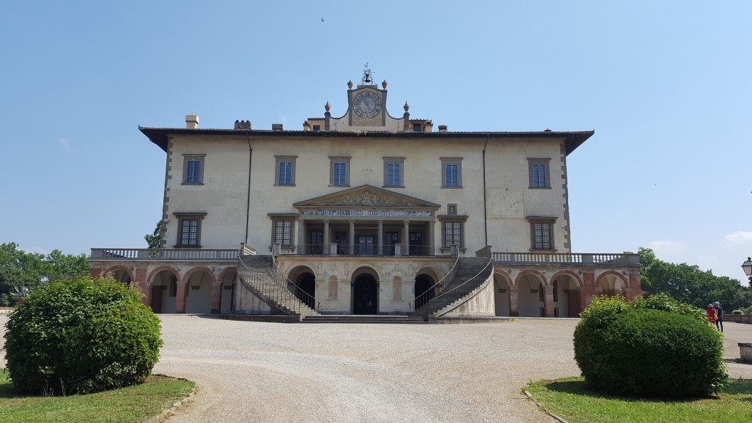 Nach einem Besuch der Geburststätte Leonardo da Vinci’s in den Olivenhainen von Vinci und den auf Sichtweite und auf den Kuppen der Hügel thronenden Kastelli und Wehrdörfern, in deren engen Gassen wir uns treppauf und -ab quälend gefragt haben, wie sich seine älteren BewohnerInnen versorgen, tauchen wir in der Villa Medici wieder in die mittelalterliche Geschichte einer Renaissancevilla mit Garten ein, von dem allerdings nur noch ein kleiner Teil in seiner ursprünglichen Gestaltung erhalten geblieben ist. Entschädigt wurden wir durch den Besuch der mit Fresken prachtvoll ausgemalten Innenräume. Auf Schritt und Tritt verfolgt von einer wachsamen Lady, die uns als einzige Besucher – wie uns schien – schnell wieder loshaben wollte. Ein Fries aus Terracotta mit allegorischen Szenen aus der griechischen Mythologie gilt als unerreicht in seiner Ausführung.