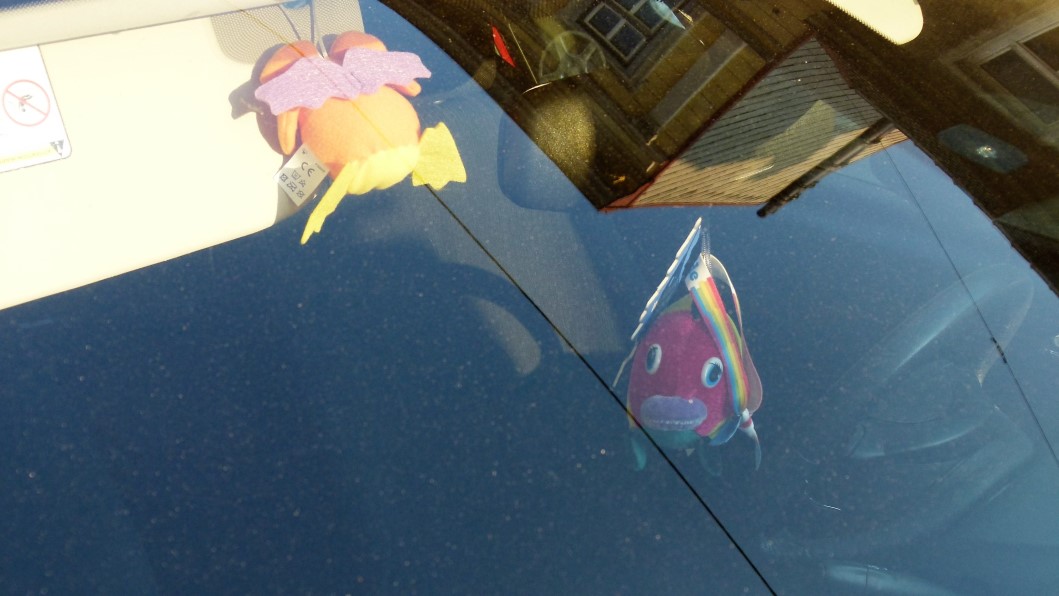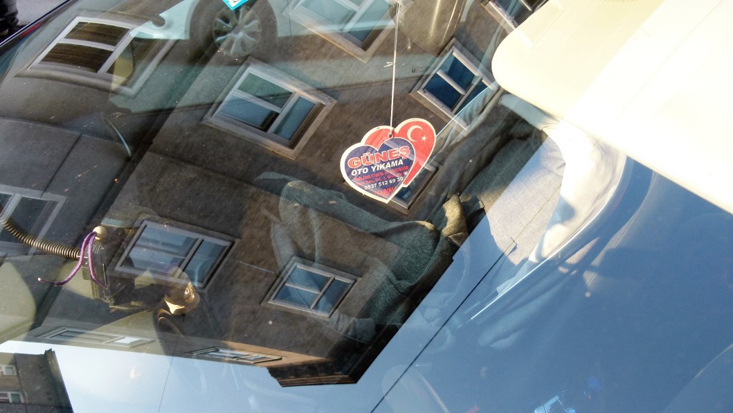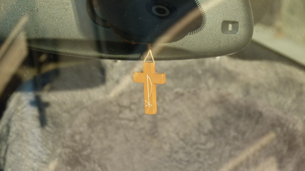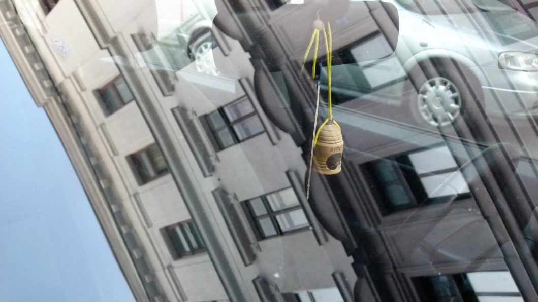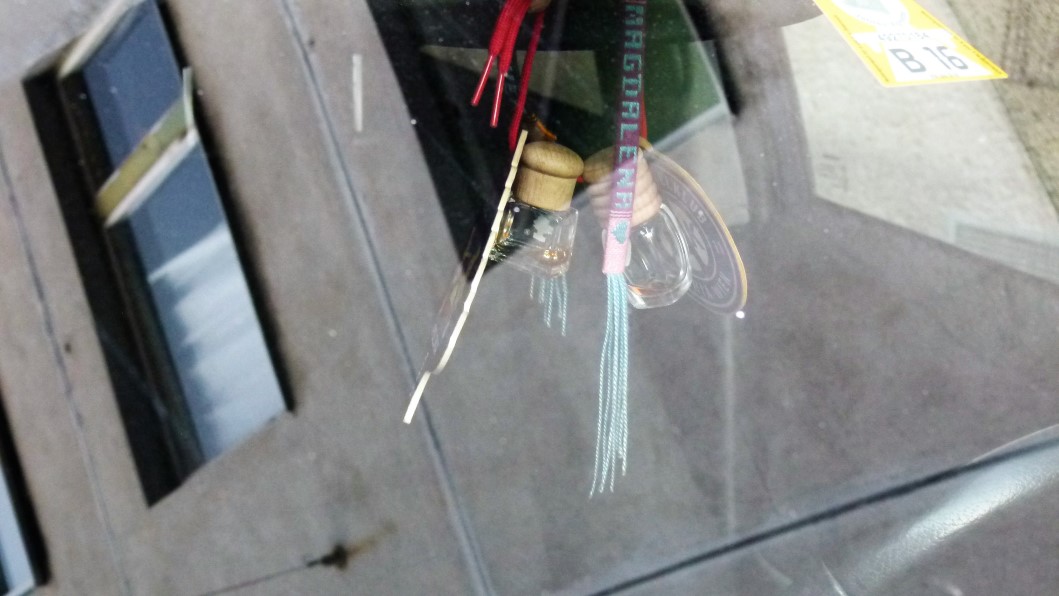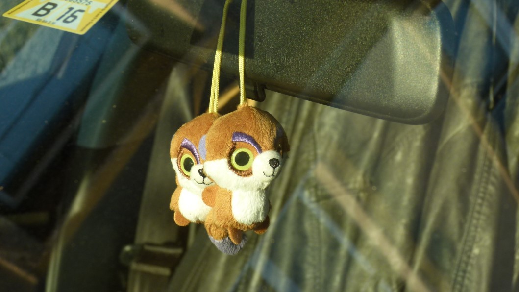 Da ich auf Spaziergängen meistens den Fotoapparat mitnehme, ist mein Blick auf der Suche nach lohnenden Motiven, die oft zu finden sind, wenn es sie auf den ersten gar nicht zu geben scheint, auf die das Straßenbild spiegelnden Windschutzscheiben gefallen. Erst beim näheren Hinsehen habe ich die meistens über dem Rückspiegel aufgehängten Objekte entdeckt. Schon nach wenigen auf einer Straße im 15. Wiener Gemeindebezirk parkenden Autos wurde mir klar, dass diese Objekte – wie das ja Mülltonnen auch tun (verzeiht mir den Vergleich) – viel über ihre Besitzer verraten. So geben sie mit den