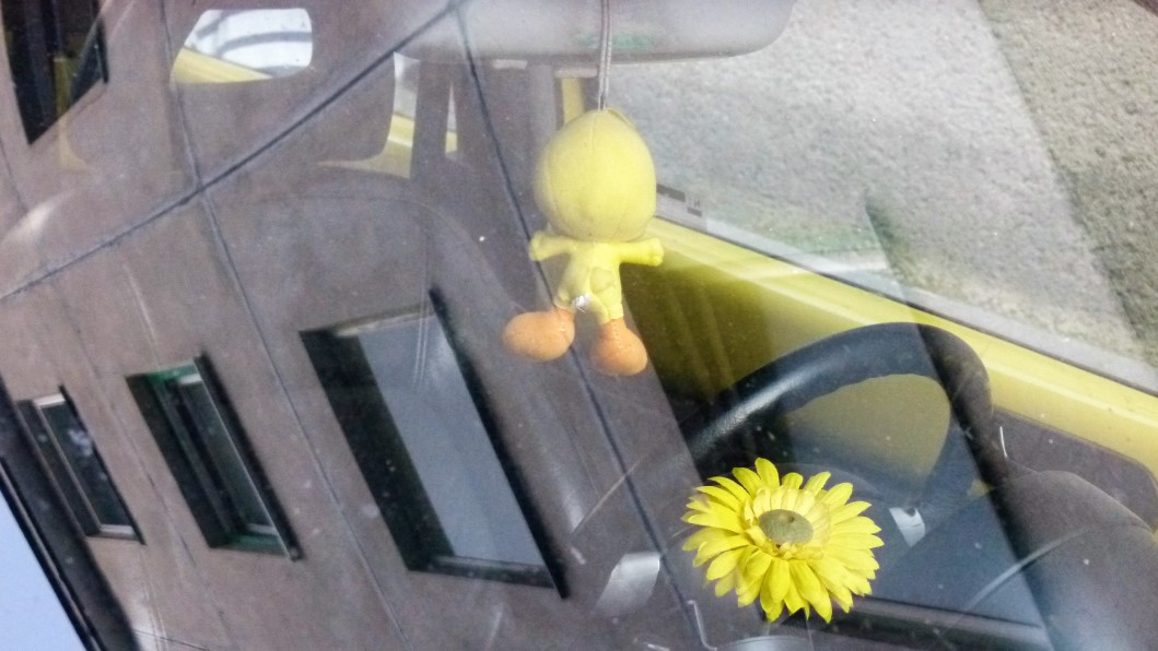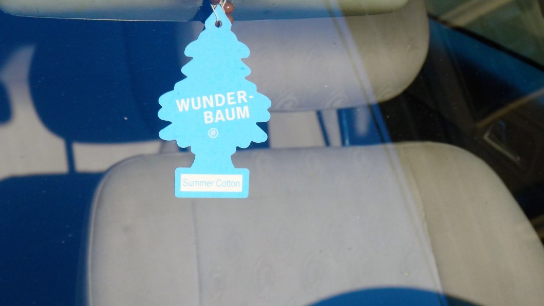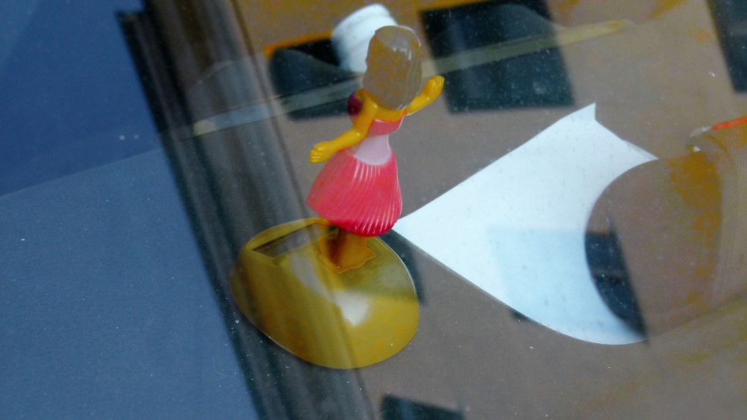 aufgehängten Wunderbäumchen zB. die von ihnen bevorzugte Duftnote preis, die – wie ich eben recherchiert habe – mittlerweile in 11 olfaktorischen Modellen als riechstoff-verbreiternder Autozubehör zu kaufen sind. Auch wie es dazu kam, ist eine interessante Geschichte und hat mit einem gewissen Herrn Sämann zu tun, der als Jude im Nationalsozialismus das Land verlassen musste. Neben vielen bunten Wunderbäumchen sind es vor allem religiöse Objekte – Madonnen Medaillons, Gebetsketten, Rosenkränze, Kreuze -, die als Glücksbringer angebracht auch die Zugehörigkeit der Zulassungsbesitzer zu einer bestimmten Konfession öffentlich machen. Nicht nur das: Sie outen sich auch als Fans diverser Fußballvereine oder wollen mit über dem Rückspiegel befestigten Mini-Boxhandschuhen zeigen, dass ihnen niemand blöd kommen darf. Manche errichten auf dem Armaturenbrett kleine Altäre mit Blumen und sich in den Hüften wiegenden Püppchen, andere bevorzugen kleine Plüschtiere, deren Farbe oft auf die des Autos abgestimmt ist. Jetzt interessiert mich natürlich, mit welcher Ausbeute ich aus einer Straße in der Innenstadt nach Hause gekommen wäre; und es reut mich, dass ich auf meinen Reisen nie recherchiert habe, welche nationalen oder überregionalen Unterschiede es bei diesen Objekten gibt, die hier die Funktion von Amuletten oder Glücksbringern, aber gleich oft – wenn ich das aus einer Straße schließen darf – die von Duftnoten haben oder solche, die nur als Dekoration gedacht sind. Feststeht, dass für den Betrachter von außen, die Windschutzscheibe zur Bühne wird, die den abwesenden Autofahrer vor den Vorhang holt. Ob er das auch weiß?
