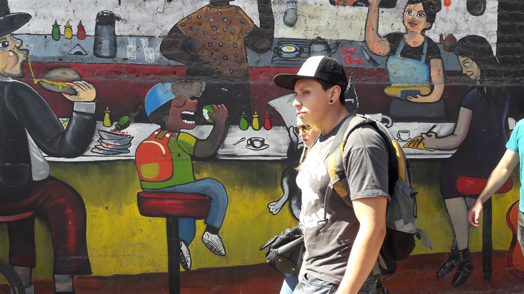 Als nach der ersten großen Weltwirtschaftskrise 1929 das Schlachthaus und die Glasfabrik zusperrten, begannen die Arbeitslosen in den heruntergekommenen und vom Abriss bedrohten Gebäude kleine Geschäfte zu errichten und ihre Habseligkeiten auszubreiten, um sie zum Verkauf anzubieten. So entstand der bis heute größte Flohmarkt Santiagos, der vor allem an den Wochenenden neben Bellavista zu einem beliebten Ausflugsziel der Stadtbewohnerinnen wurde. Auf den Flaniermeilen zwischen den Lagerhäusern unterhalten Tanzdarbietungen, Zauberer, und Karaoke singende Frauen und Männer die Besucher: Wer hier nicht fündig wird, hat nicht gesucht oder belohnt sich nach preiswertem Einkauf, aber gewöhnungsbedürftigem Lärm inmitten der Antiquitäten, Bücher, Kleider, Werkzeuge, Elektronik und Möbel mit einem Essen chilenischer, peruanischer oder argentinischer Küche. Ich gönne mir eine Huatita, eine für Maria ekelerregende Speise, die ich mit Kutteln übersetzen würde.