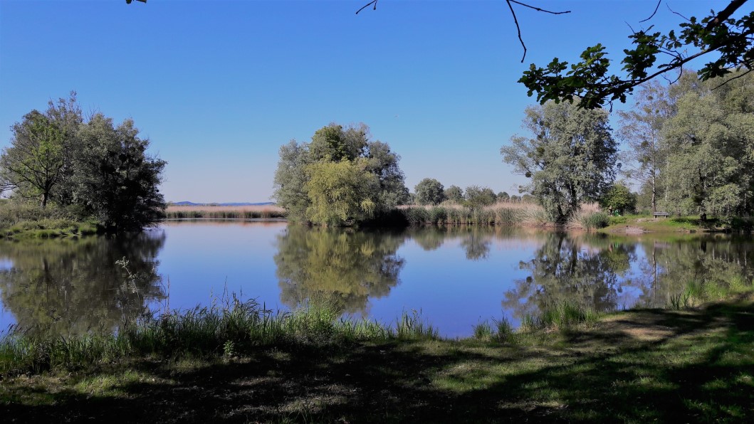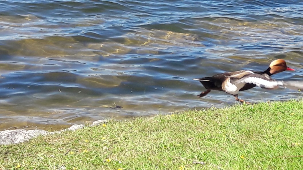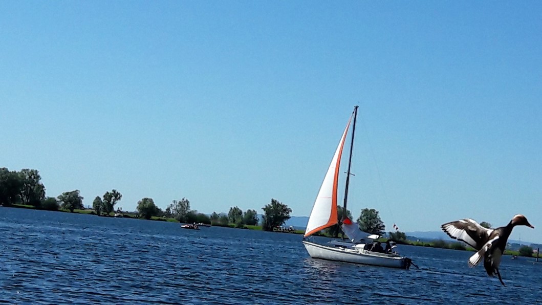 Wie auf ein Kommando nehmen fünf Enten – mit ihren Flossen paddelnd – Anlauf, erheben sich über das Wasser, ziehen die Flossen ein und schreiben – ein schnatterndes Geschwader – ein langgezogenes U in den wolkenlos blauen Himmel.