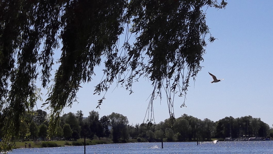 Schau, sagt Mutter und zeigt auf einen Schwan, der bewegungslos – uns keinen Seitenblick gönnend – das Wasser pflügt. Gespiegelt – weiß auf blauem Grund – zieht er an uns vorbei, – sich das Beiwort majestätisch verdienend. Eine Brise kommt auf und peitscht die tief ins Wasser hängenden Zweige einer Ulme.