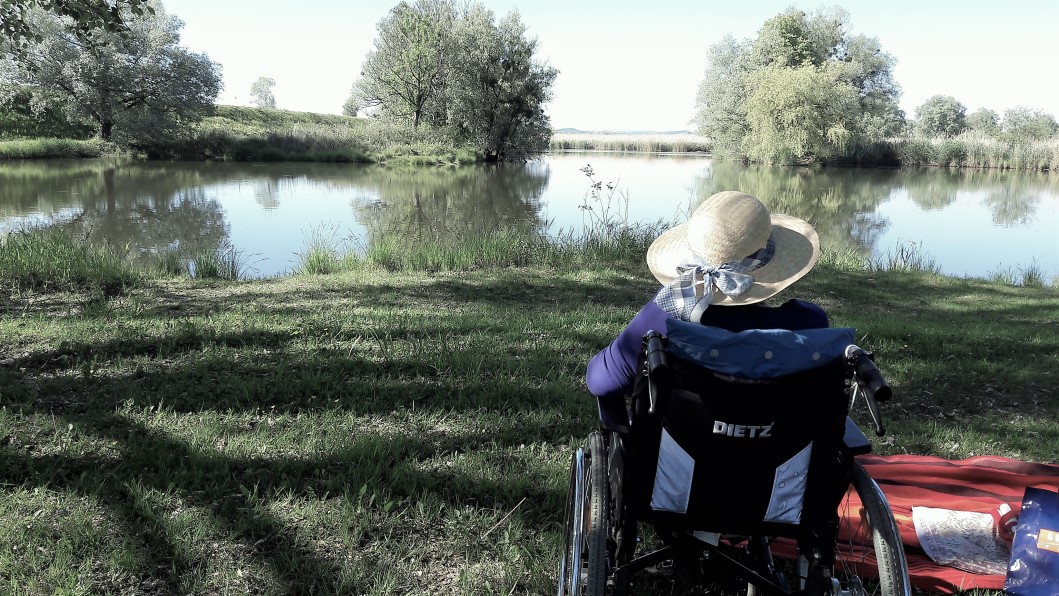 Sie sitzt im Rollstuhl und schaut auf den See.