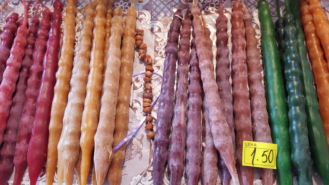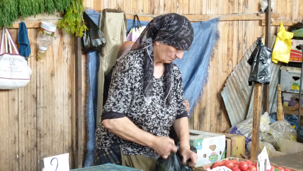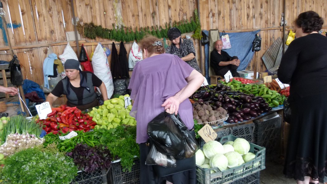Der Duft von ofenfrischem Tonis Puris, wie die Brote hier heißen, lockt uns in eine Bäckerei. Wie diese Gluthitze, der vom Ofen ausgeht in dem kleinen Raum, der nicht mehr als drei Menschen Platz bietet und auch Verkaufsraum ist, ertragen werden kann, bleibt uns ein Rätsel. In einem Lokal, dessen Treppe in das Untergeschoß führt, lassen wir uns mit Khachapuri und Khinchali verwöhnen, Teigtaschen, die den Dumplings in China ähneln. Für Vegetarier ist Georgien ein Eldorado. Alles Gemüse und Obst stammt von lokalen Märkten. Hier kann es vorkommen, dass Passanten mit Marktfrauen sich zu einem spontanen Stelldichein einfinden und einen vielchorigen Gesang anstimmen.