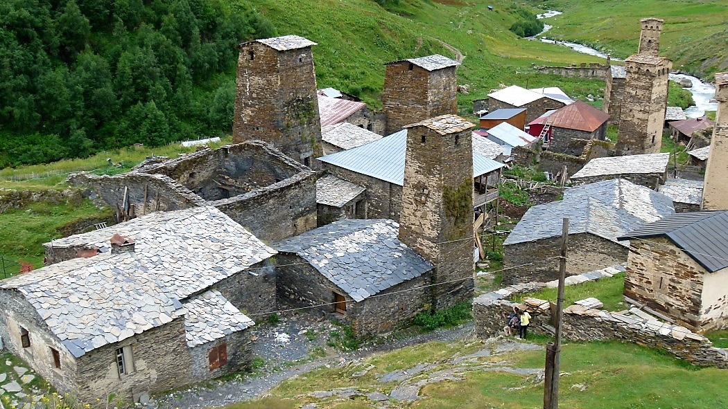 Es ist schwer etwas zu beschreiben, das so überwältigend schön ist, dass man im ersten Augenblick nur stammeln kann: Wow. Ist das wirklich oder träume ich? Nicht einmal Adishi hat uns auf diesen spektakulären Anblick vorbereitet: Ein Tal eingeschlossen von hohen Bergen mit einem tosenden Wildbach über den eine steinerne Rundbogenbrücke führt. Das könnte in den Alpen Norditaliens, Frankreichs, der Schweiz oder in Österreich sein. Dörfer aber auf 2.200 m Meereshöhe – seit der Bronzezeit durchgehend bewohnt – findet man in Europa vermutlich nur noch in Georgien, und wir würden jede/n seiner Landsleute beleidigen, wenn wir es zu Asien zählten. Das aber ist es nicht, was meine von vielen Reisen verwöhnten Augen sehen. Sie sehen eine Kette von mittelalterlichen Bergdörfern mit steinalten Häusern, umgürtet von einem Wald aus tausendjährigen Türmen, eingebettet zwischen einer Schlucht, durch die sich der Enguri schlängelt und steilen Almwiesen; im Hintergrund der von Wolken und Nebel eingehüllte Shkharagletscher, einer der höchsten Gipfel des Hohen Kaukasus, den wir heute nur vermuten können Nicht umsonst wurde eines der 4 Dörfer zum Weltkulturerbe erklärt. Ushguli (furchtloses Herz): Wir sind am eigentlichen Ziel unserer Reise angekommen.