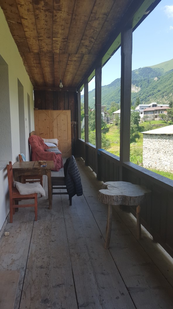 Wir finden das Guesthouse nicht. Zwei Polizisten sind ebenfalls überfordert, obwohl das Dorf nicht einmal 2000 Einwohner hat. Mit einer GPS.Ortung können sie uns endlich die Richtung zeigen, in die wir losmarschieren müssen. Mittlerweile hat es zu regnen begonnen. Im Regen schaut Mestia noch trostloser aus. Nach einigen Umwegen haben wir das Guesthouse Mountain View gefunden. Nur Mushkudiani Manor ist noch stilvoller eingerichtet, das wir auf dem Rückweg von Ushguli aufgesucht haben. Uns erwartet ein renoviertes Bauernhaus mit gewienerten Dielen, ein angenehmer Raum mit Dusche und einer Tür, die ins Freie und einer anderen, die auf die Veranda führt. Noch wissen wir von dem fantastischen Frühstück nichts, das uns am nächsten Morgen erwarten wird. Booking com könnte hier ruhig zumindest 9,5 Punkte von 9,9 zu erreichenden vergeben.
