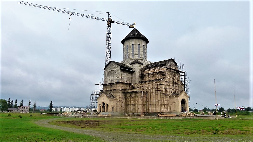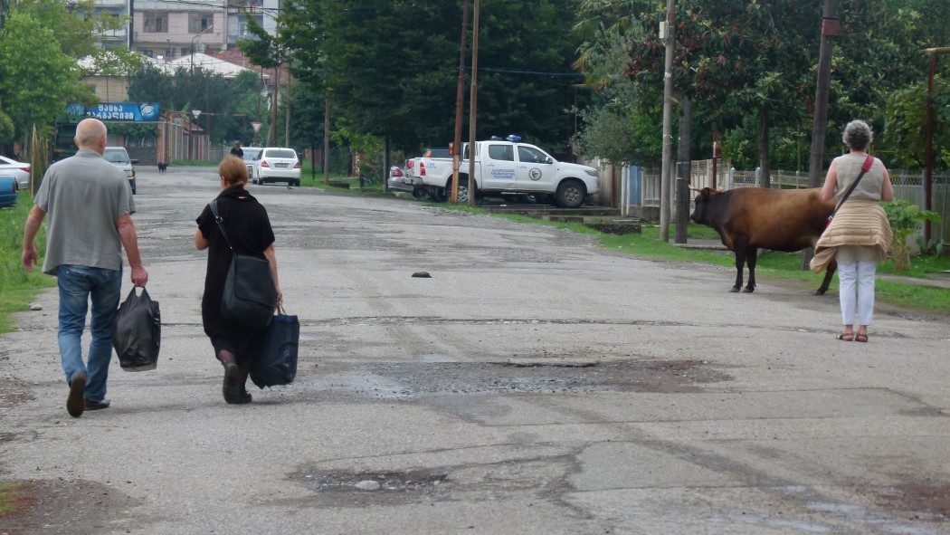 Zuerst aber suchen wir die Unterkunft in der Stalinstraße, draußen am Stadtrand, wenn Zugdidi überhaupt den Status einer Stadt hat. Ein Provinznest mit Ostblockcharme ist es eher. Kein Ort, der zum Bleiben einlädt. Außer einer Bandstraße wie im Wilden Westen, eine breite von Platanen gesäumte Avenida, die pfeilgerade die Stadt durchquert, sonst nur im Nichts endende Straßen, die in Feldwege münden, wo sich Hunde Gute Nacht sagen. Die meisten humpeln, weil sie angefahren worden sind. Vom Zerfall bedrohte Häuser, Kühe, die am Straßenrand weiden. Eine im Bau befindliche orthodoxe Kirche mitten im Nirgendwo. Ein Rohbau noch aus purem Beton. Die Kirche scheint das Geld zu haben, das für die Instandhaltung der öffentlichen Gebäude fehlt.