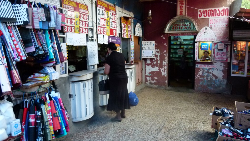 Vor dem Bahnhof, der von außen sogar sehr ansehnlich ausschaut, stehen Marschrutkas; Minibusse, die weder von Schlaglöchern, von fehlendem Asphalt oder Staus in den Straßen von Georgien aufgehalten werden können; sie werden wohl eine schnelle Flucht möglich machen, denken wir uns, nachdem wir den Bahnhof gesehen haben. Für die Marschrutkas gibt es kinen festen Fahrplan. Zu entlegeneren Strecken fahren sie, wenn der Bus voll ist. Oder sie lesen die Fahrgäste auf dem Weg auf. Das erfordert Geduld. Viel Geduld.