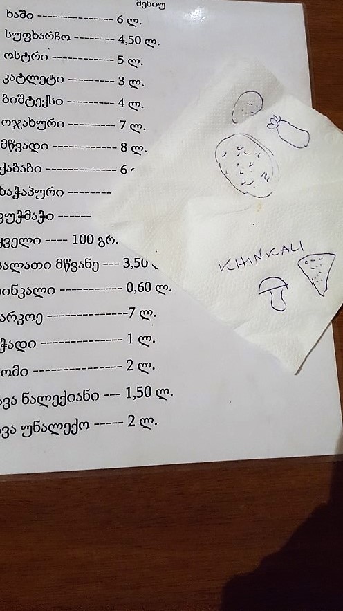 Das Unternehmen war erfolgreich, das andere weniger. Noch immer quält uns der Hunger. Endlich finden wir ein Lokal. Die Karte aber ist nur für Einheimische zu lesen. Selbst die auf eine Serviette gemalten Pilze, Tomaten und Gurken, nicht einmal die Kinkalis werden als solche erkannt oder gibt es ganz einfach nicht. Wie ein Hendl gackern oder ein Schaf blöcken wollte ich nicht. So groß war der Hunger doch nicht. Wir geben auf. In der Not tut`s auch ein McDonald, in dem sich die Jugend des Städtchens ein Stelldichein gibt.